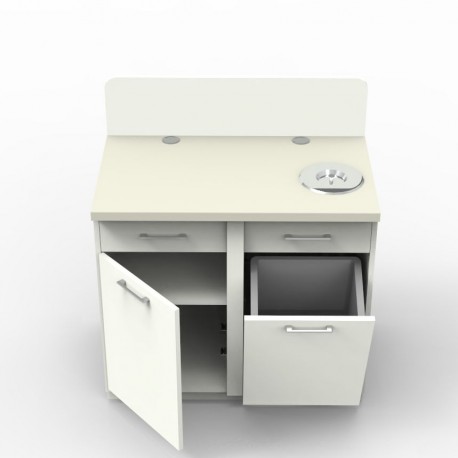 Meuble poubelle de tri avec 1 poubelle basculante de 30 litres et 1 poubelle de 8 litres intégrée dans le plan de travail pour trier les déchets en entreprise.
