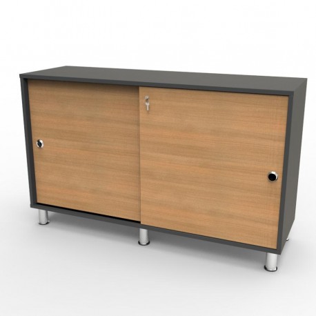 Meuble de rangement bas en bois avec portes coulissantes pour optimiser l'espace des bureaux professionnels.